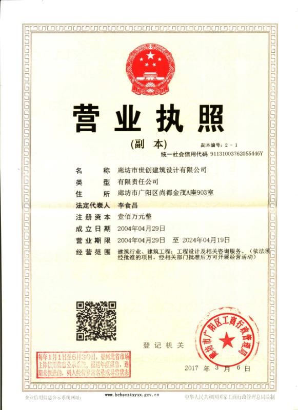 廊坊市世創建筑設計有限公司,原為廊坊市規劃設計院建筑工程設計所。成立于1997年,多年來本公司在社會各界人士的關心、支持下,不斷發展壯大。自2006年3月1日起具有國家建設部核準的建筑工程乙級設計證書,證書編號為:A213006026。企業法人營業執照,注冊號:131003000011148 我公司自創建以來完成各類工業與民用建筑設計、咨詢項目共有三百五十多項,建筑面積近三百萬平方米,工程所在地涵蓋廊坊、天津、北京等地區。并有...